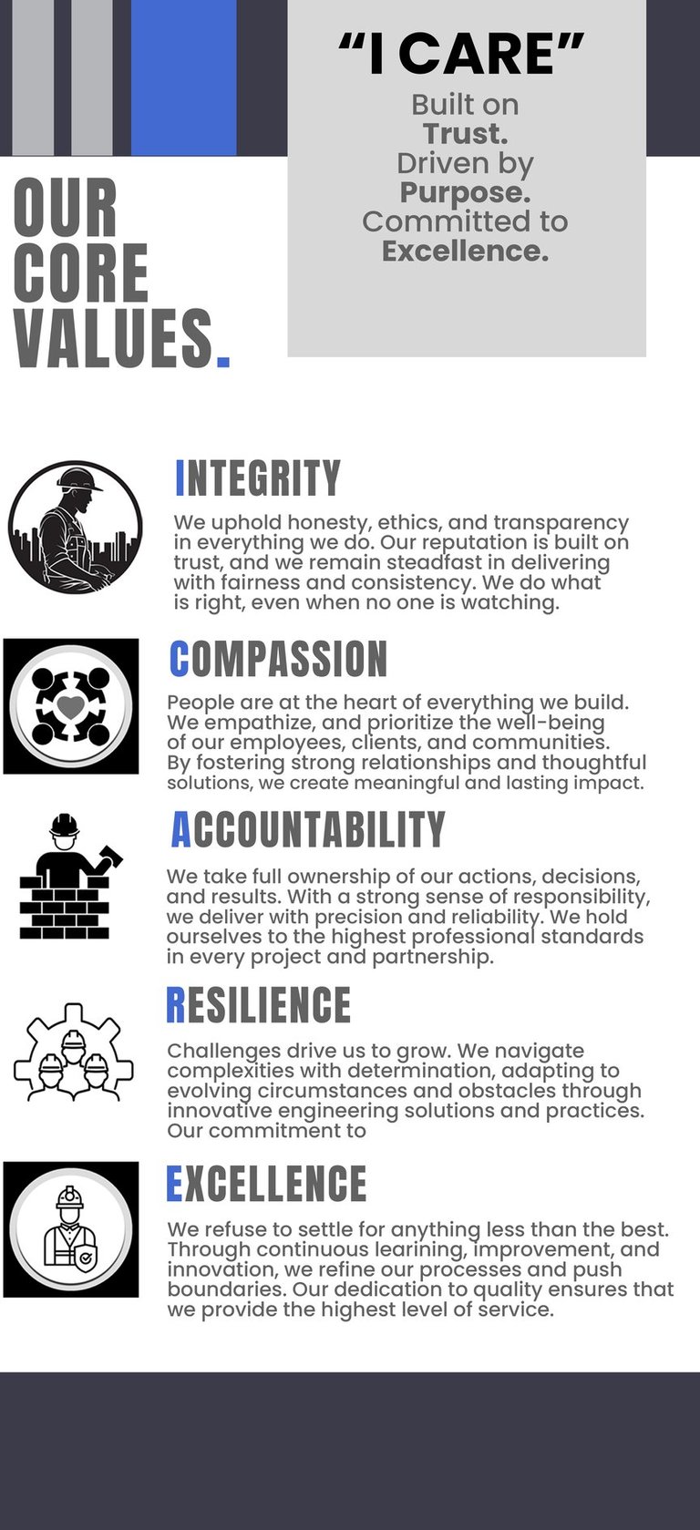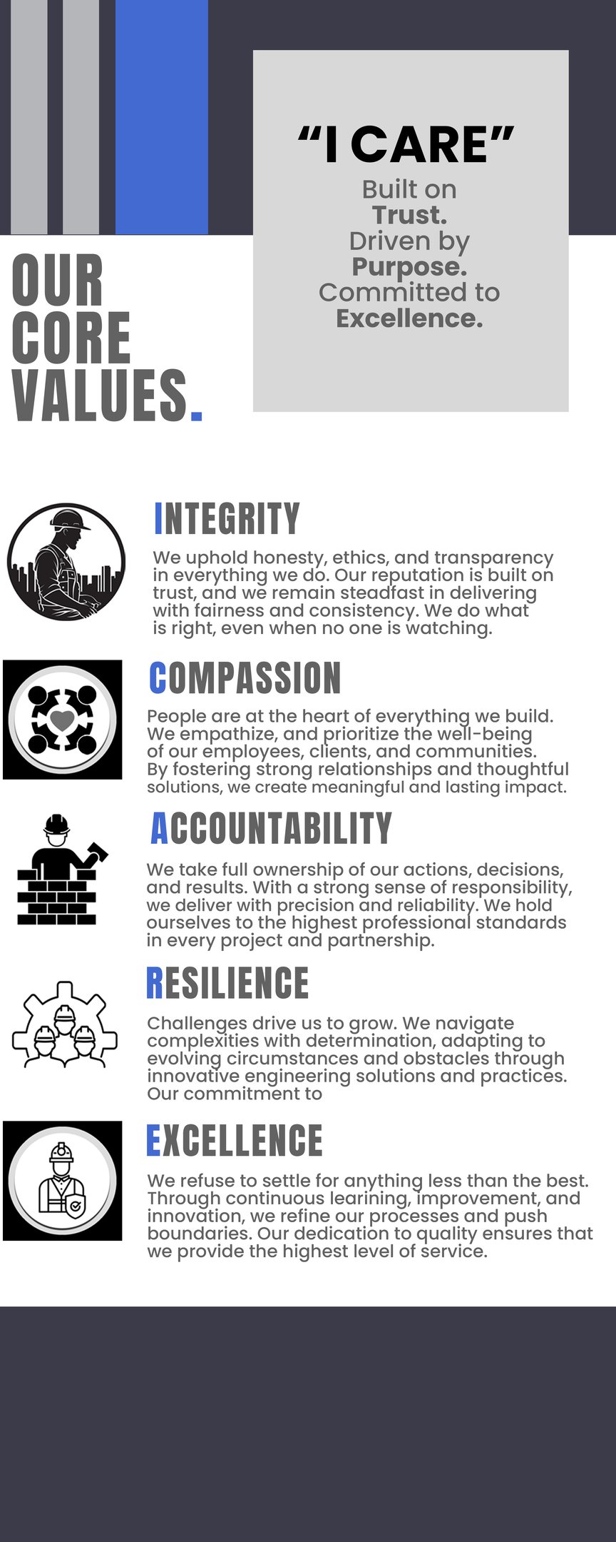 We deliver first-class design and build solutions, constructing high-quality residential, commercial, and industrial structures. Committed to excellence, we drive growth and sustainability for our clients, employees, and stakeholders through innovation, integrity, and superior craftsmanship.
